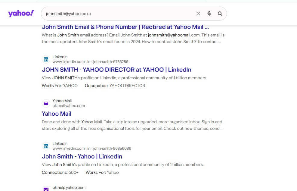 - Collez l'adresse e-mail complète dans le moteur de recherche Yahoo pour trouver les profils sur les réseaux sociaux, les messages sur les forums ou autres sites web où la personne a utilisé cette adresse e-mail.