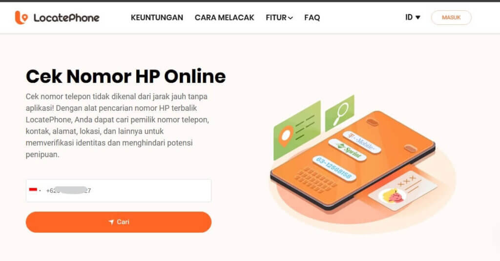 LocatePhone offers a local reverse phone lookup service with access to as much information as possible. The website can be accessed via major internet providers such as Telkomsel, Axiata, and Indosat Ooredoo. It scans the public database to help find owner of Indonesia phone number online. All you need to do is: