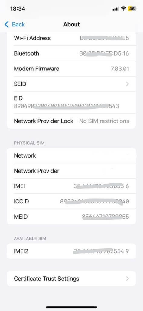 - Scroll down to find the EID, IMEI/MEID and ICCID information.