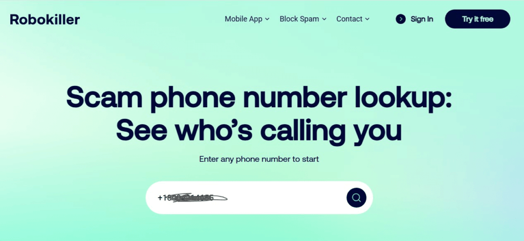 Robokiller, milyarlarca telefon numarasında hızlı kontroller yapmak için tasarlanmış özel bir spam arama aracıdır. Özellikle, numaranızın durumunun sonucunu Robokiller web sitesinde göreceksiniz. Bunu kullanmak için: