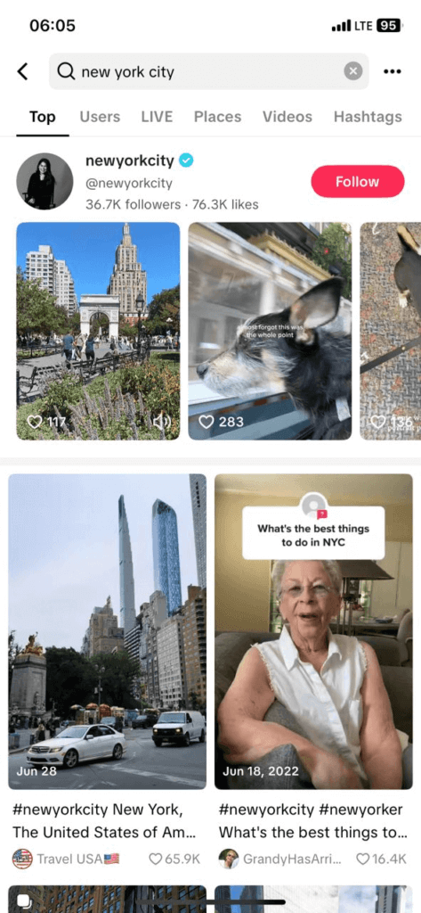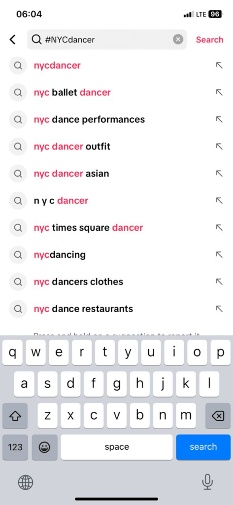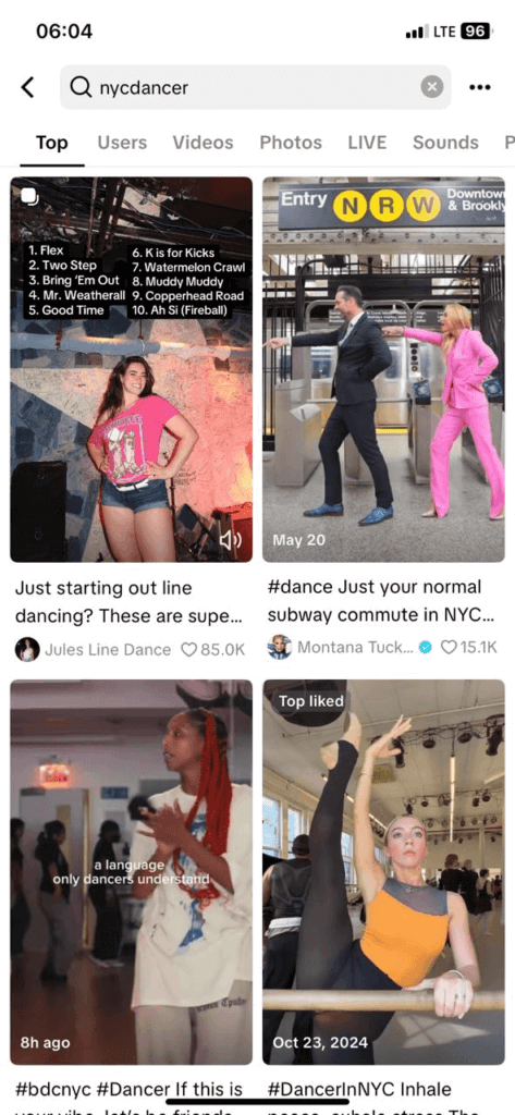 • Start by searching TikTok using niche hashtags that resonate with your target audience. For example, if you believe that they are a dancer in New York, search #NYCdancer or similar combinations.