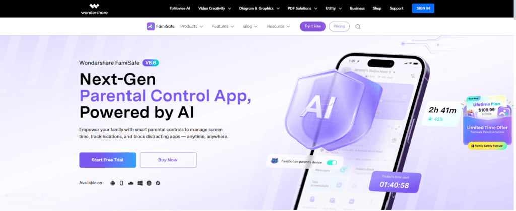 Wondershare Aile güvenliğiGerçek zamanlı konum takibi, uygulama engelleme ve etkinlik raporu gibi özelliklere sahip olan , etkisiz bir ebeveyn kontrol uygulamasıdır. Ebeveynler, coğrafi sınırlar oluşturmak, sosyal ağları izlemek ve çocuklarının telefonundaki uygunsuz içerikleri tespit etmek için bu fırsatı değerlendirebilirler. Bu uygulama, güvende ve dijital olarak sağlıklı olmak isteyen aileler için idealdir.